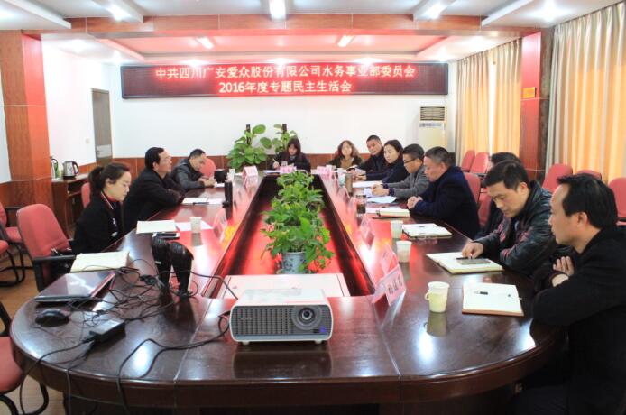 2017年2月28日,水務(wù)事業(yè)部黨委在三樓會議室召開了以“兩學(xué)一做”學(xué)習(xí)教育為主題的2016年度領(lǐng)導(dǎo)班子專題民主生活會。水務(wù)事業(yè)部領(lǐng)導(dǎo)班子成員,黨委、紀(jì)委全體委員參加會議;行政管理部有關(guān)人員列席會議。...